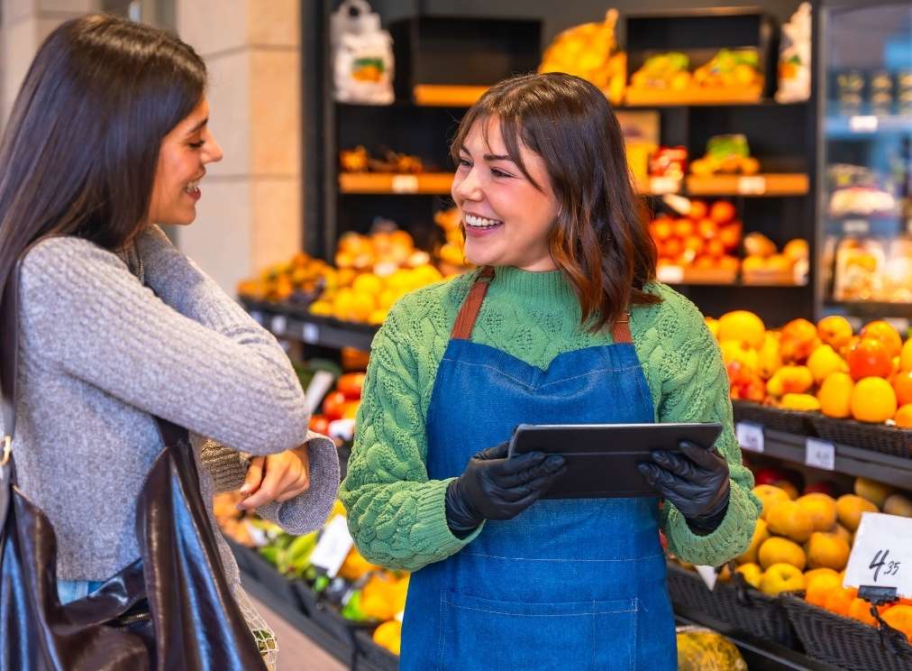 une jeune femme avec un tablier discute avec une autre femme dans un supermarché, entourées de fruits et légumes