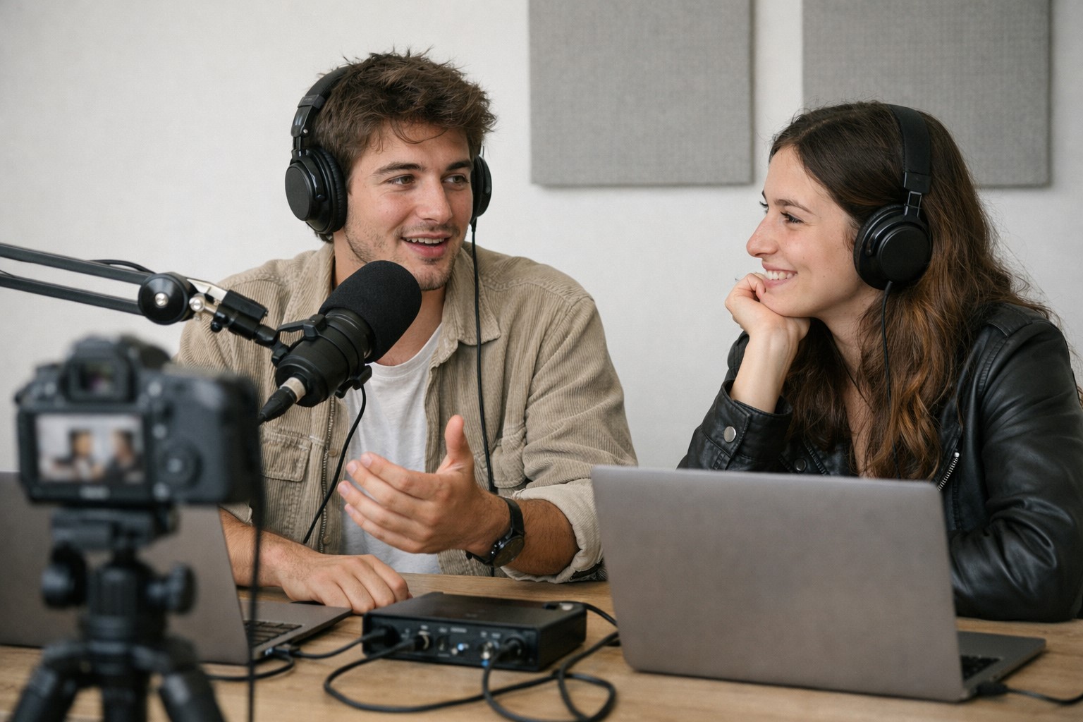 Deux jeunes en train d'enregistrer un podcast vidéo dans un studio simple avec un micro et une caméra, ambiance détendue et professionnelle