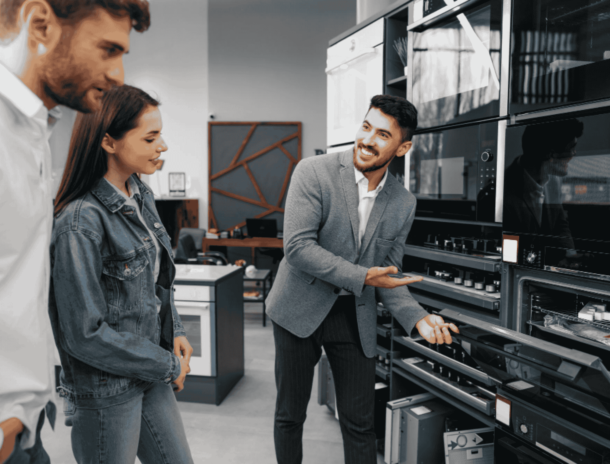 vendeur dans un magasin d'électroménager ouvrant un four pour faire une démonstration à des clients, un homme et une femme