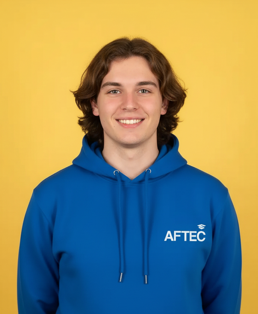 trois jeunes devant un écran et souriant. celui de gauche et l'étudiante de droite portent tous les deux un sweat AFTEC bleu. l'étudiant du milieu porte un t-shirt noir basique. les deux jeunes à gauche ont la peau blanche et la jeune à droite à la peau de couleur noir