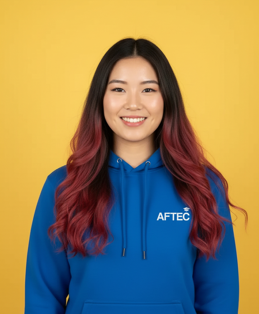 trois jeunes devant un écran et souriant. celui de gauche et l'étudiante de droite portent tous les deux un sweat AFTEC bleu. l'étudiant du milieu porte un t-shirt noir basique. les deux jeunes à gauche ont la peau blanche et la jeune à droite à la peau de couleur noir