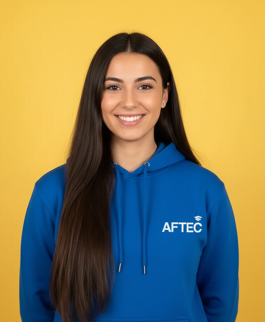 trois jeunes devant un écran et souriant. celui de gauche et l'étudiante de droite portent tous les deux un sweat AFTEC bleu. l'étudiant du milieu porte un t-shirt noir basique. les deux jeunes à gauche ont la peau blanche et la jeune à droite à la peau de couleur noir