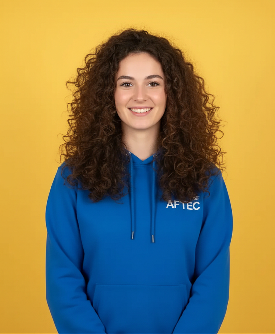 trois jeunes devant un écran et souriant. celui de gauche et l'étudiante de droite portent tous les deux un sweat AFTEC bleu. l'étudiant du milieu porte un t-shirt noir basique. les deux jeunes à gauche ont la peau blanche et la jeune à droite à la peau de couleur noir