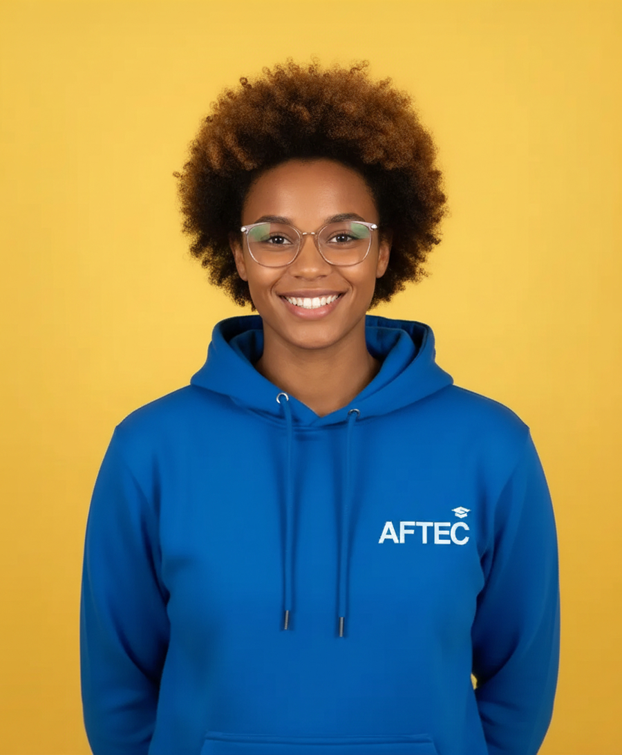 trois jeunes devant un écran et souriant. celui de gauche et l'étudiante de droite portent tous les deux un sweat AFTEC bleu. l'étudiant du milieu porte un t-shirt noir basique. les deux jeunes à gauche ont la peau blanche et la jeune à droite à la peau de couleur noir