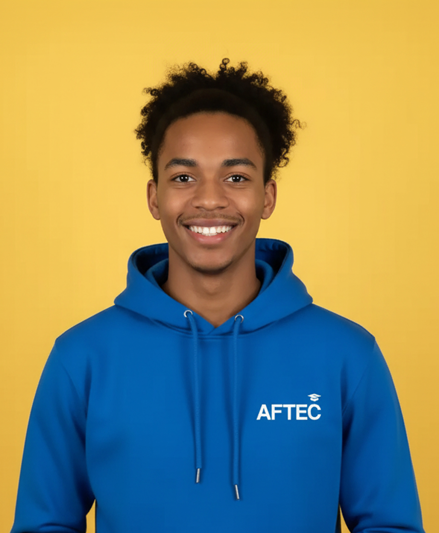 trois jeunes devant un écran et souriant. celui de gauche et l'étudiante de droite portent tous les deux un sweat AFTEC bleu. l'étudiant du milieu porte un t-shirt noir basique. les deux jeunes à gauche ont la peau blanche et la jeune à droite à la peau de couleur noir