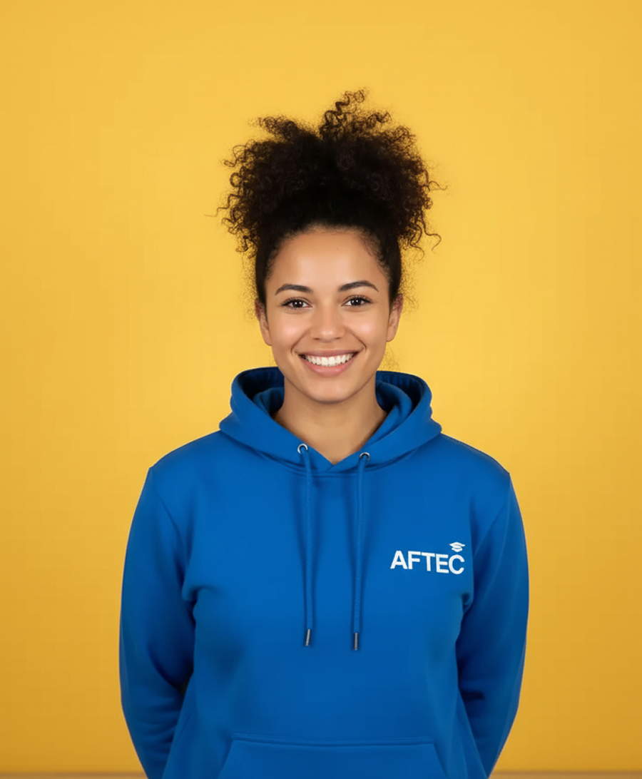trois jeunes devant un écran et souriant. celui de gauche et l'étudiante de droite portent tous les deux un sweat AFTEC bleu. l'étudiant du milieu porte un t-shirt noir basique. les deux jeunes à gauche ont la peau blanche et la jeune à droite à la peau de couleur noir